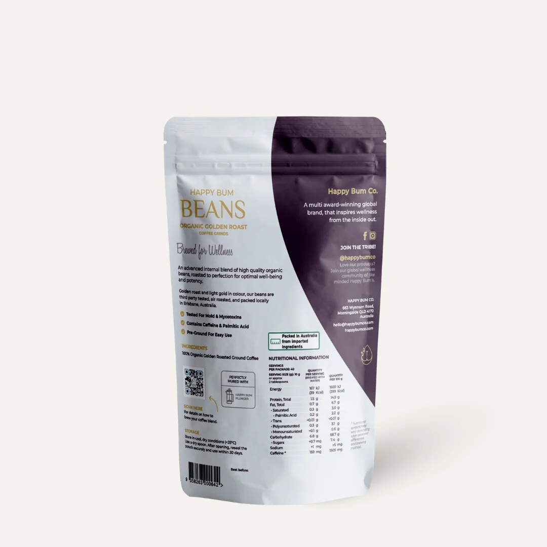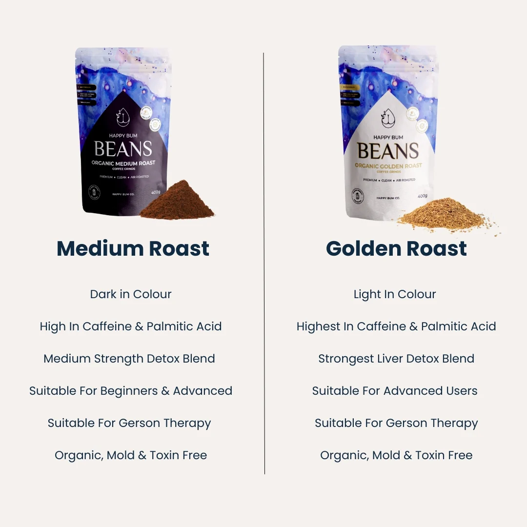 Our Golden Roast coffee grinds are light gold in colour and the highest in palmitic acid and caffeine boasting the maximum glutathione production and liver detoxification benefits. Pre-Ground for convenience. Happy Bum Gold Roast enema coffee is ethically sourced, 100% organic fair-trade coffee from the purest crops in South and Central America, this blend has been specialty air roasted and scientifically tested for maximum potency.
