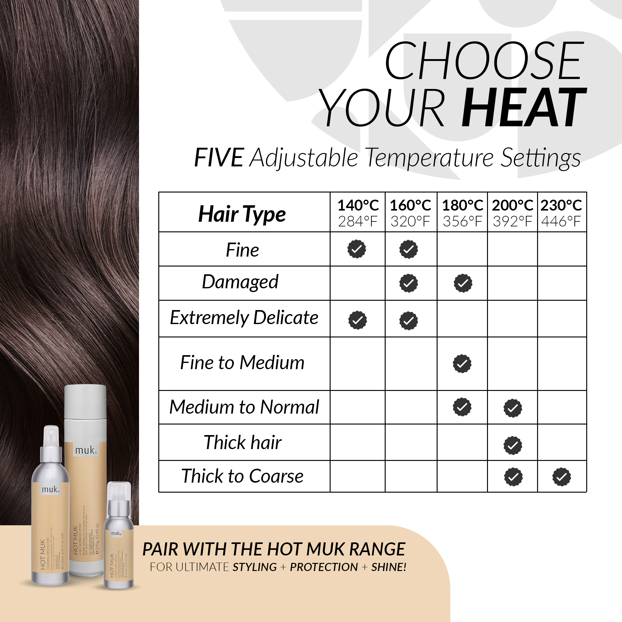Do not use on wet or damp hair. Dry off hair completely. Use Hot muk Thermal Protector prior to straightening the hair to protect against heat damage. Suitable for all hair types.